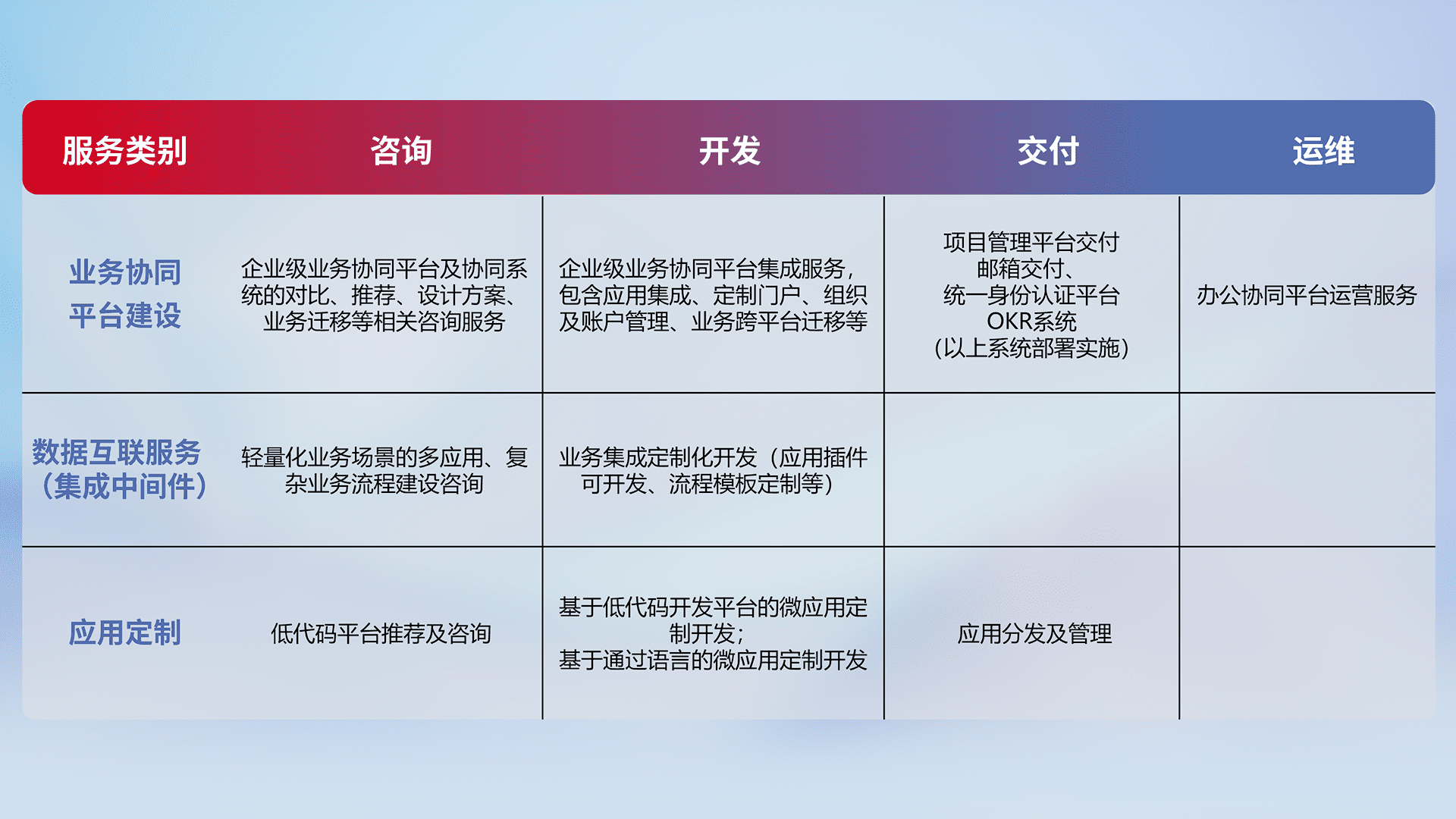 针对钉钉、、企微、、IDaas等平台级产品提供产品的规划、、、、方案、、、交付、、、定制化开发等服务,,,实现如统一协同办公、、智能客户服务、、混合会议管理、、、、智能数据查询、、、等业务场景,,,,实现数字化转型。。。