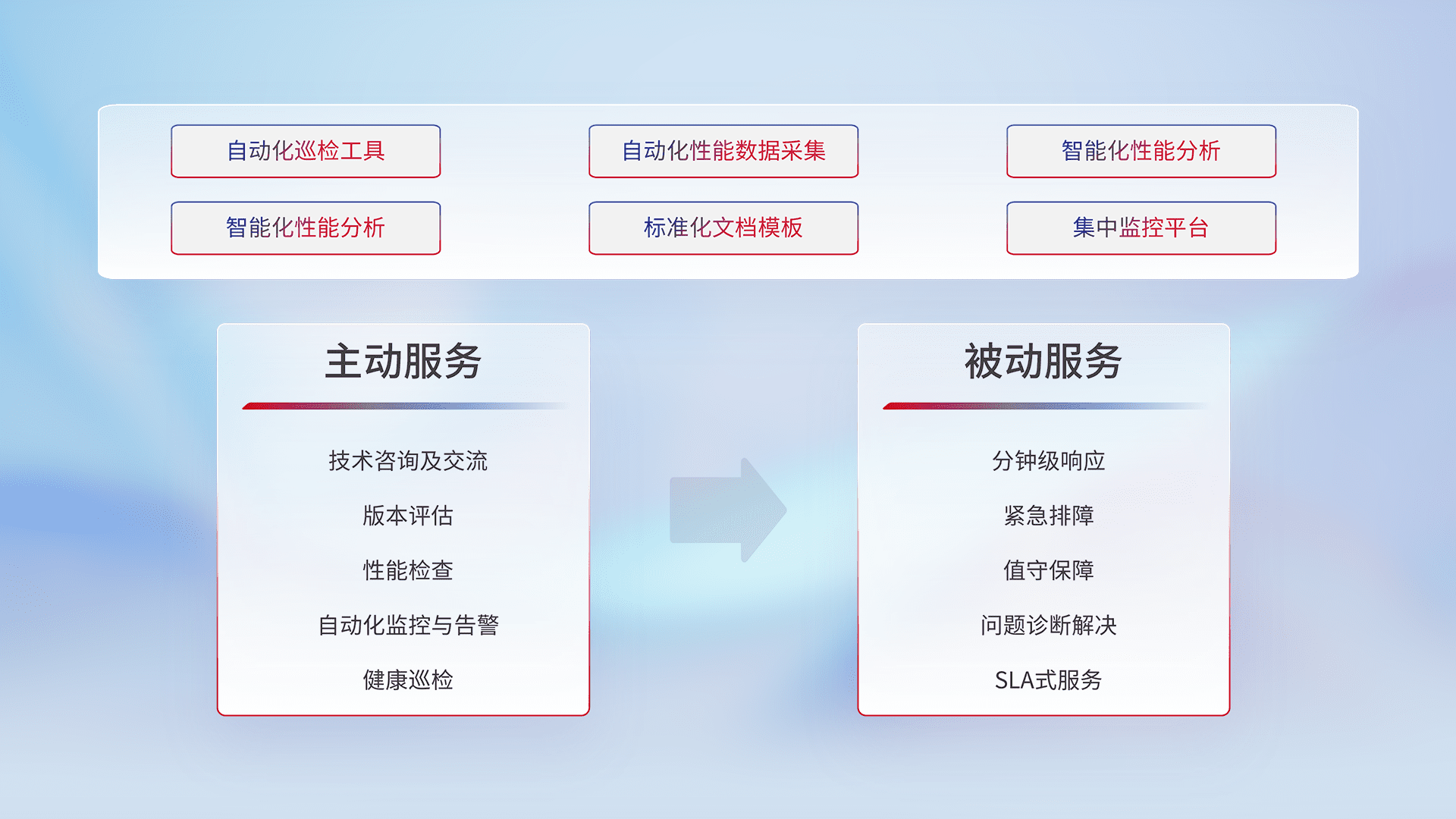 智能化工具和标准化文档,,保障服务质量,,,提供主动服务(包含技术咨询、、、版本评估、、性能检查、、、、自动化监控与告警、、、、健康巡检)和被动服务包含(分钟级响应、、、、紧急排障、、、值守保障、、、、问题诊断解决、、SLA服务)。。